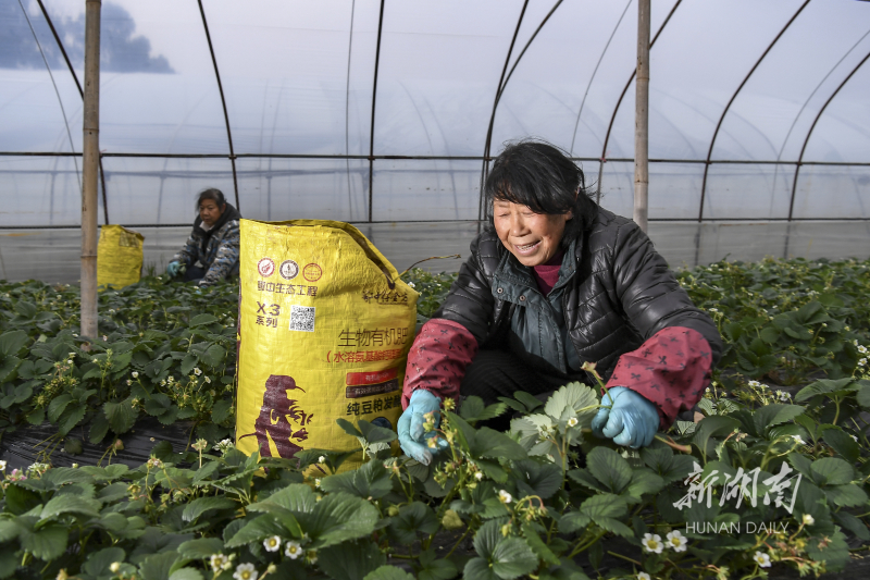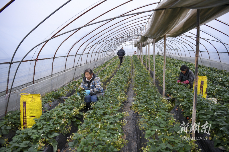 2月19日,长沙市天心区大托铺街道新港村,农户对草莓苗进行养护。雨水节气,各地农民抢抓农时进行大棚管护、春播耕地等农事活动,田间地头一派繁忙。湖南日报全媒体记者 辜鹏博 摄