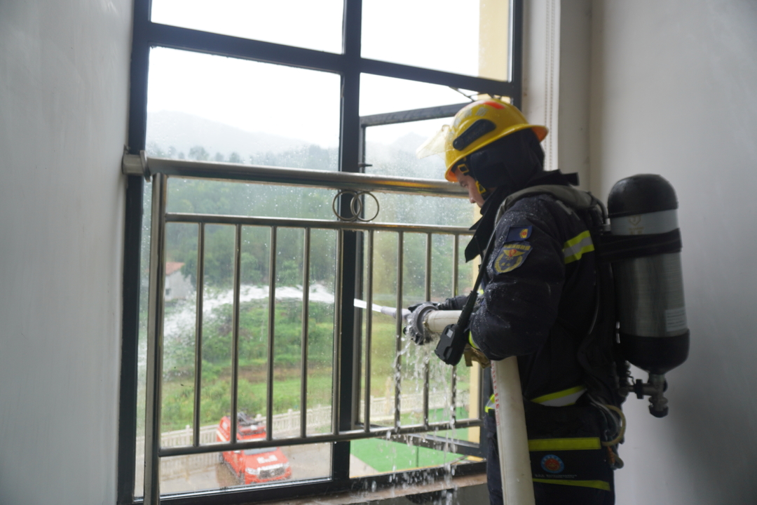 “熟悉”完毕后,正式开始了实战演练。演练假设敬老院三楼一房间因电线短路引发火灾,院内工作人员立即启动应急预案,组织老人快速有序的到达制定的安全位置。与此同时,消防救援人员赶赴现场。到场后,指挥员根据了解到的情况立即安排部署战斗编成,从实战角度出发锻炼消防救援人员应对突发事件的处置能力。整个过程分工明确、队员们各司其职,对“火势”蔓延方向进行设防堵截,经过十分钟的紧张救援,“大火”被成功扑灭。