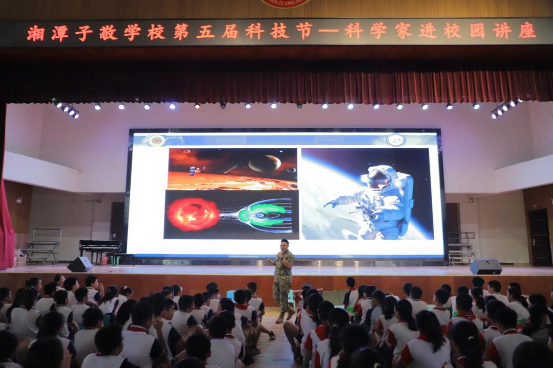 华声在线9月19日讯(通讯员 蒋伟东)9月16日,湖南省科学技术协会“科学家进校园”活动在湘潭子敬学校火热开展。国防科技大学空天科学学院甄明老师以《认识太空、利用太空、保护太空》为主题,为师生带来一场精彩纷呈的科普交流。