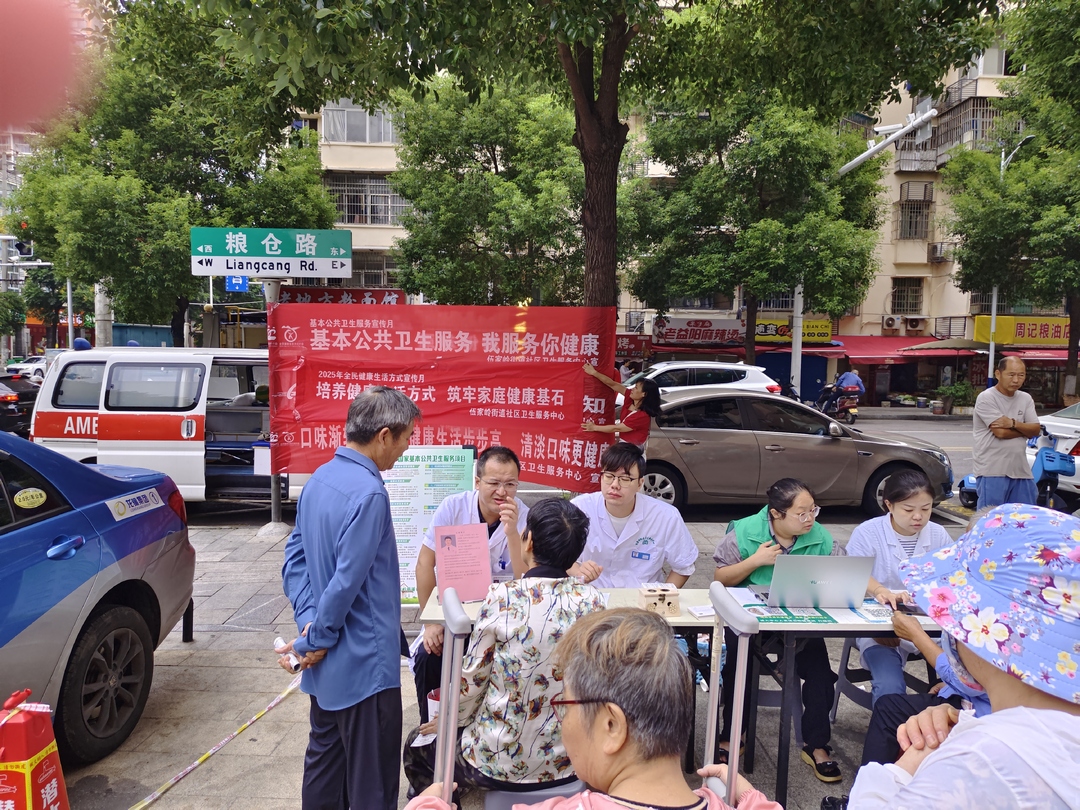 义诊现场,伍家岭街道社区卫生服务中心慢病科成员张容、曹嘉攀、刘雪玲、候佳现场为居民提供免费血压血糖测量、心肺听诊等基础检查,针对老年人、慢性病患者等重点人群,详细询问健康状况并给出个性化诊疗建议。在国家基本公共卫生服务咨询区,工作人员通过发放折页、现场讲解,向居民介绍项目涵盖的城乡居民健康档案管理、慢性病患者健康管理、老年人健康体检、预防接种等12类免费服务内容,引导居民主动参与、享受服务。