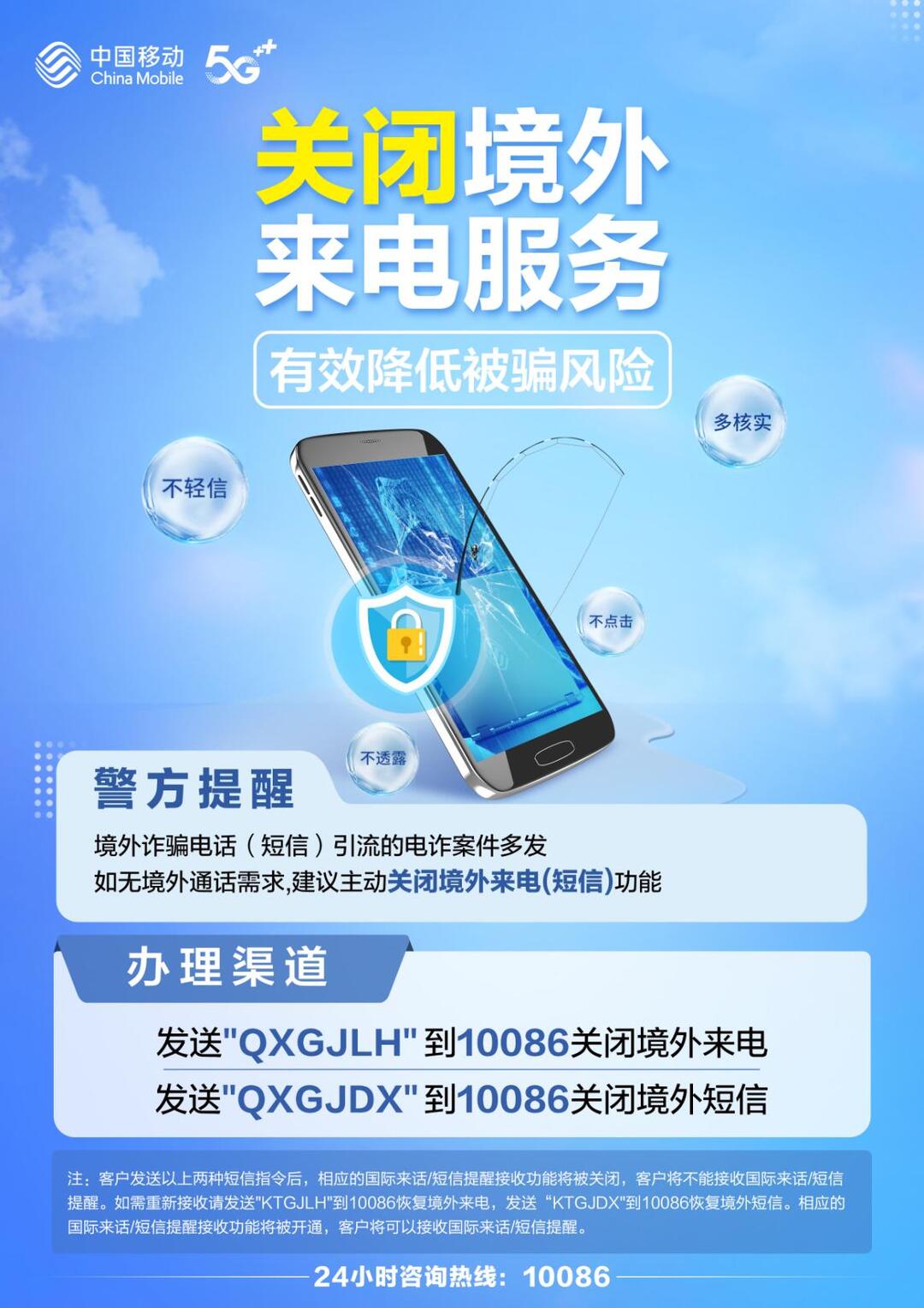 为了帮助用户有效阻断诈骗信息的传播路径,中国移动充分发挥技术优势,开通了短信快捷办理通道。该项服务严格遵循“用户自主、免费办理、即时生效”的设计原则,充分保障了用户的通信自主权。用户可以根据自身需求,自主选择是否关闭境外来电和短信接收功能,既方便又实用,为防范境外诈骗筑起了一道坚实的屏障。