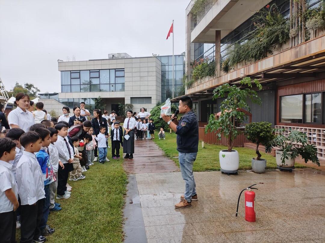 9月22日上午,随着急促的模拟火灾警报声响起,演练正式开始。各班老师迅速行动,按照预定方案,引导幼儿用湿毛巾捂住口鼻,弯腰低姿,沿着指定疏散路线快速、有序地向操场安全区域撤离。疏散过程中,老师全程守护,及时提醒幼儿“不推挤、不慌张、快跟上”,有效保障了疏散秩序和幼儿安全,短时间内,全体师生安全撤离至指定集合点,各班老师立即清点人数并向演练总指挥汇报,确保无一名幼儿遗漏。疏散结束后,人人居安万教官现场演示了灭火器的正确使用方法,详细讲解“提、拔、握、压”四步操作要领,对防毒面具也进行了讲解,进一步提升了全体师生的应急处置能力。同时强调消防安全需常抓不懈,要求大家将所学知识运用到日常,时刻紧绷安全之弦。