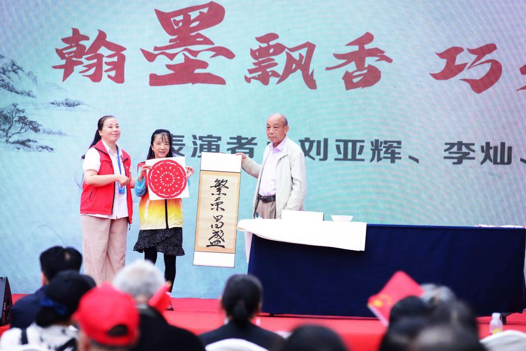传统文化展示环节,社区居民刘亚辉、李灿、尹德芳带来了精彩的现场书法和剪纸表演。笔墨挥洒间,一幅幅祝福祖国的作品跃然纸上;巧手裁剪下,精美的中秋主题图案栩栩如生,展现了民间艺术的魅力,传递了团圆吉祥的节日寓意。