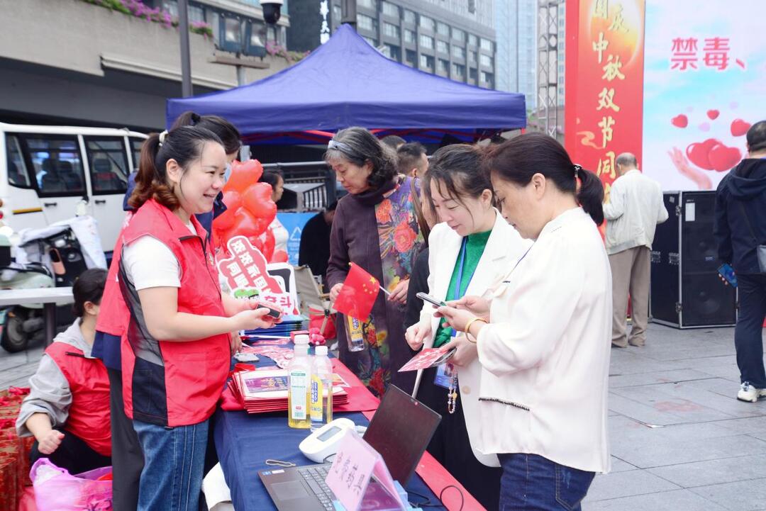 此外,活动设有分会场和便民服务区。在社区五楼会议室,居民们共同制作手工月饼,体验传统技艺,感受中秋团圆温情;在春风街37号区委宿舍,社区组织开展了防空疏散演练,警报响起后,居民和商户有序撤离,实战化提升了应急避险能力。庙街广场前坪的展台区,通泰街街道社区卫生服务中心提供了免费健康义诊,并宣传国家基本公共卫生服务项目;同时,政策咨询、便民服务等展位也吸引了大量居民驻足,切实将服务送到群众身边。