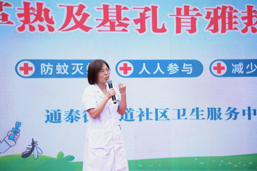 健康科普环节,通泰街社区卫生服务中心医生杨荣就登革热及基孔肯雅热的预防知识开展了微宣讲。她详细介绍了蚊媒疾病的传播途径、症状表现及家庭防蚊灭蚊措施,倡导居民保持环境卫生,做好个人防护,受到中老年群体的特别关注。