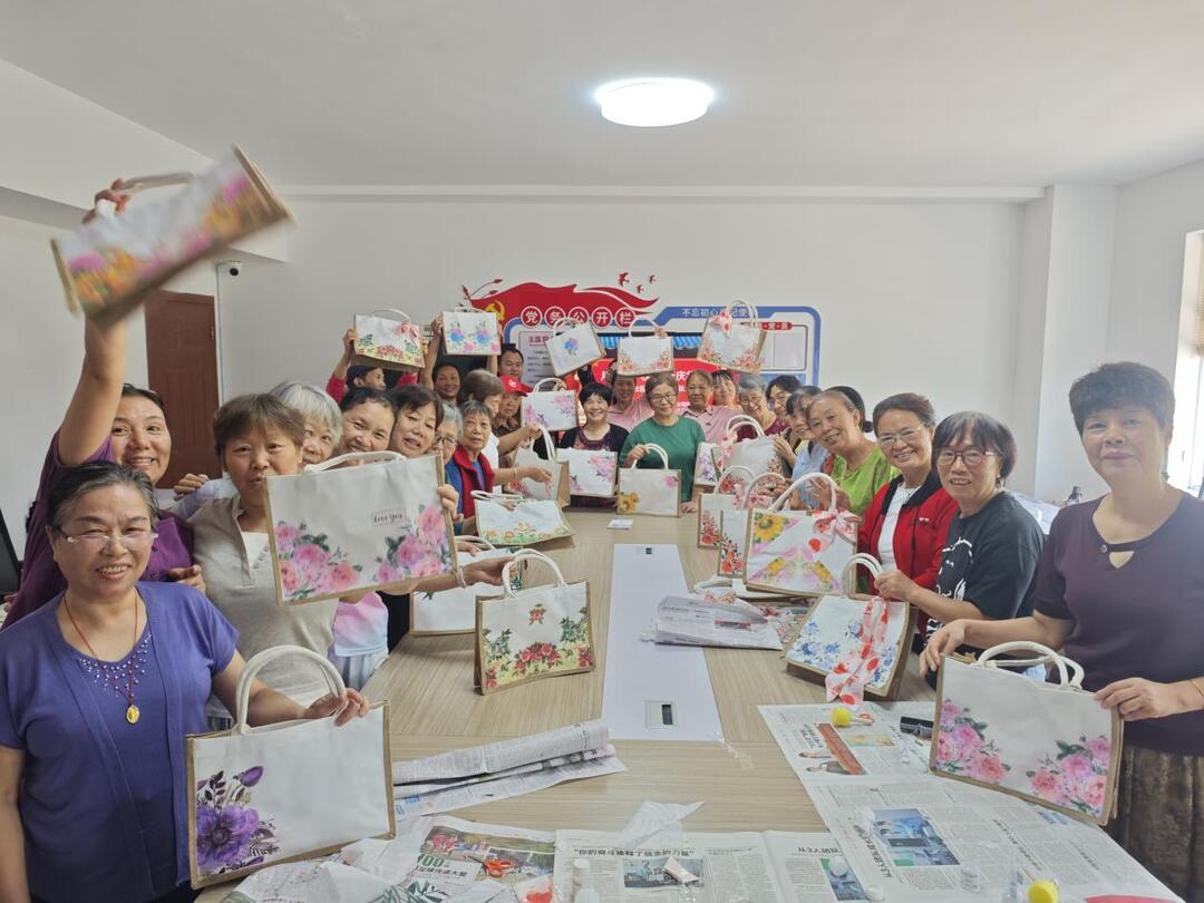 紧接着,环保帆布袋拓印环节拉开帷幕。志愿者详细讲解拓印步骤与技巧后,带领大家动手创作。居民们精心挑选图案模板,有的选中秋玉兔、圆月,有的选国庆五角星、红旗,围坐在一起交流配色心得。遇到操作难题,社工、志愿者及时上前协助,在众人巧手下,一个个色彩斑斓、独具匠心的帆布袋逐渐成型,承载着对美好生活的向往与家国安康的祝福。这小小的帆布袋,不仅是实用的环保手工艺品,更成了连接邻里情感的温馨纽带。