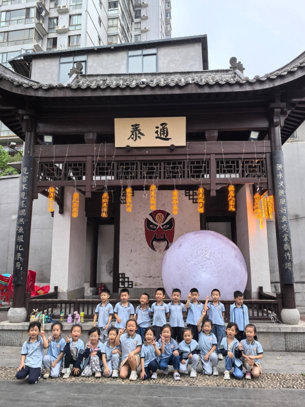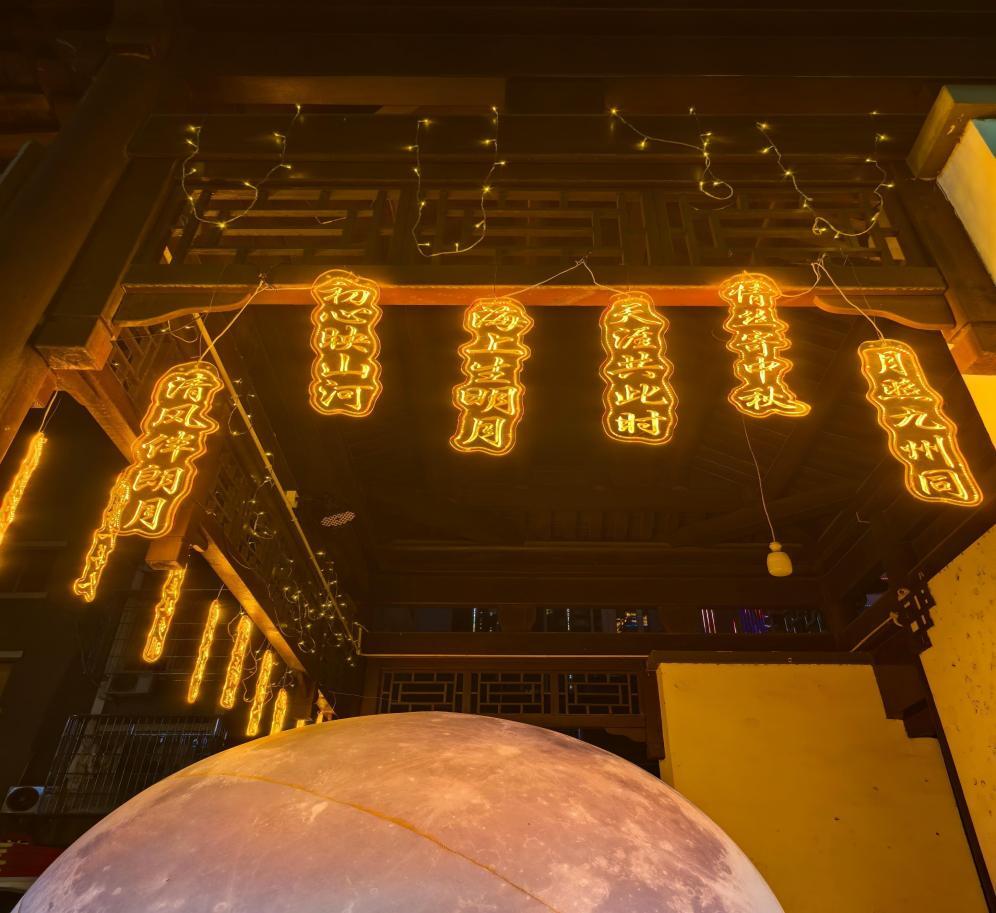 老街上的通泰戏台装饰一新,木质廊柱上悬挂起数十个印有“情丝寄中秋、清风伴朗月”等含有中秋和清廉元素诗句的灯牌,廊柱间缠绕着氛围灯,废旧轮胎再利用制作而成的月饼造型上写着“通泰”字样,戏台中间硕大的月亮造型吸引着大家纷纷合影拍照。