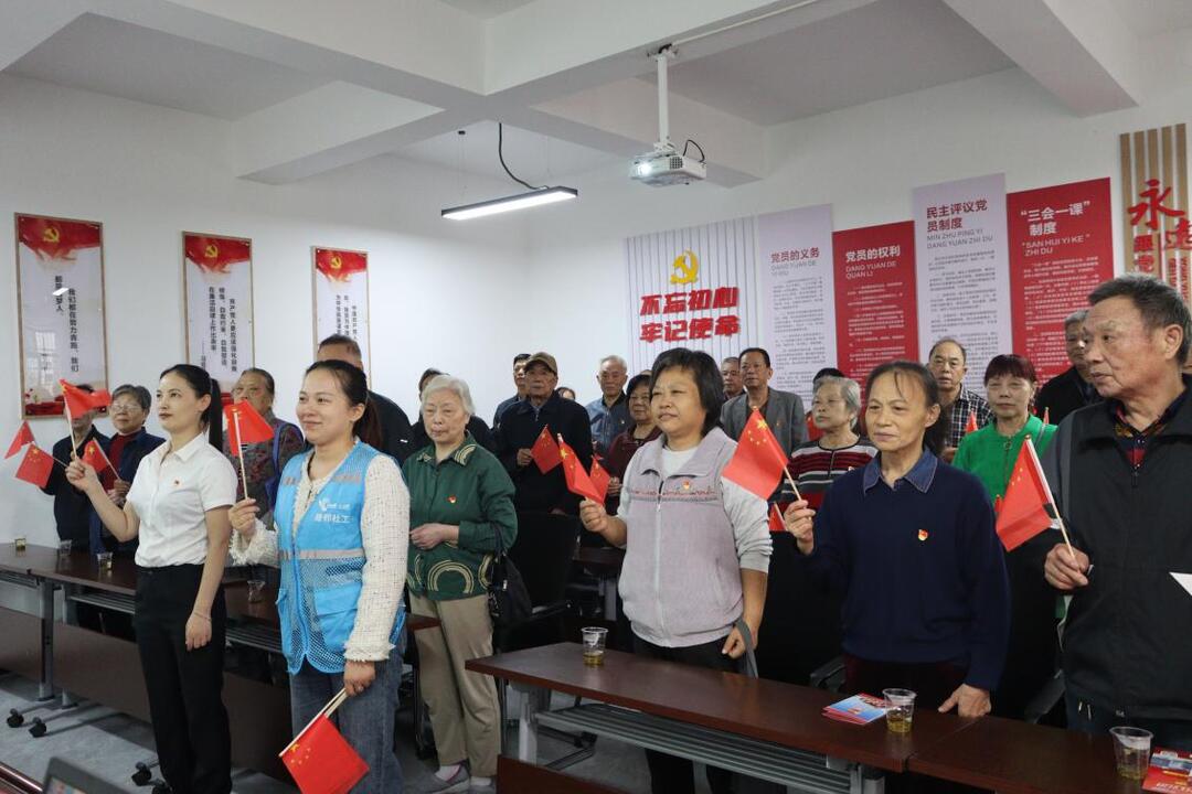 活动在激昂的旋律中拉开帷幕。全体社区党员和居民群众手持鲜艳的五星小红旗,精神饱满地齐声高唱《没有共产党就没有新中国》。嘹亮的歌声响彻社区,表达了对祖国母亲的深切热爱与美好祝福,展现了社区党群一心、昂扬向上的精神风貌。