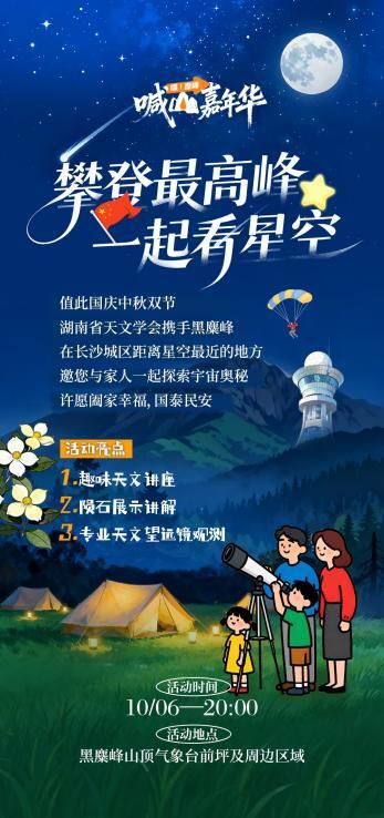华声在线9月30日讯(通讯员 周旅 曾静宜)金秋送爽,山河披锦。10月1日至8日,长沙黑麋峰国家森林公园将正式启动“嘿!麋峰”喊山嘉年华系列活动。本届嘉年华以“登峰·观星·乐山·悦味”为主题,深度融合自然生态、天文科普、户外音乐与湖湘美食,为广大市民游客打造一场集参与性、体验性与教育性于一体的国庆文化盛宴。