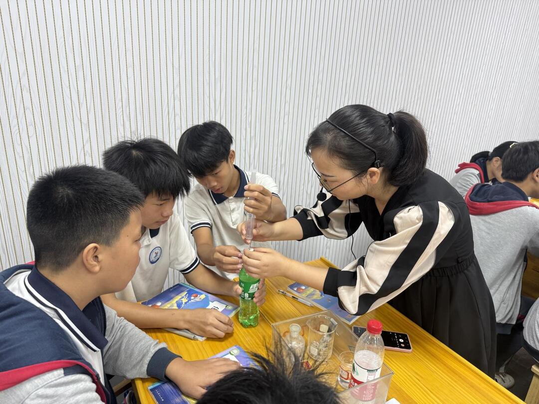 江南镇中学教师唐艳率先带来九年级化学课,她以生活中常见的“打开雪碧时,有什么现象”为切入点,通过实物展示、实验演示双重引导,将抽象的化学反应原理转化为直观现象,在唐老师的引导下,学生动手实验,充分展现了化学学科“从生活中来、到实践中去”的教学思路。