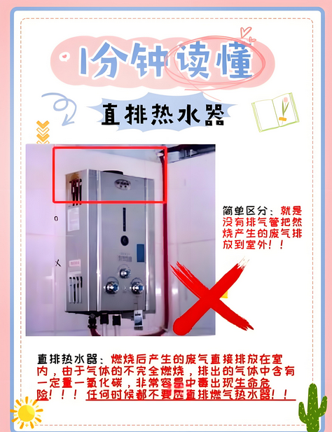 6.1.3直排式燃气热水器不得设置在室内。燃气采暖热水炉和半密闭式热水器严禁设置在浴室、卫生间内。