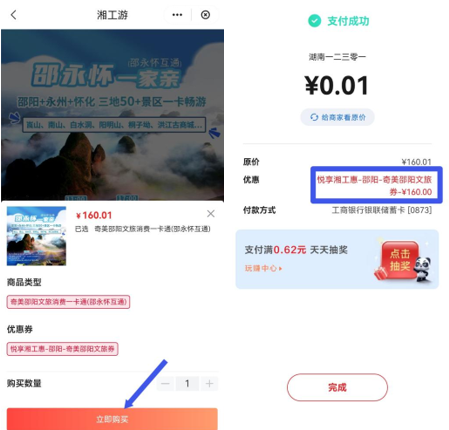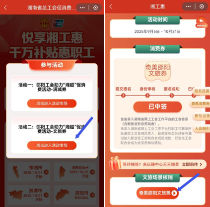 如何核销兑换?职工需先通过“云闪付”APP进入湘工惠小程序,随后在活动页面查看邵阳市“中签”信息,确认中签后,即可按照提示完成0.01元核销兑换流程,将这份超值文旅福利收入囊中。