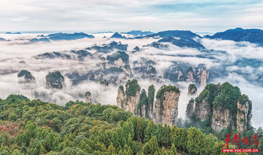 9月29日傍晚,张家界武陵源黄石寨景区雨后云海翻腾,群峰若隐若现,宛如仙境。