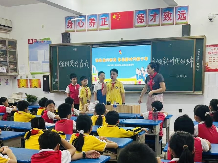 三四年级聚焦“重温‘六知一会’”,通过齐唱队歌、规范系红领巾等环节,强化队员的礼仪规范与组织意识。活动现场,队员们互相检查红领巾的佩戴情况,激昂的队歌声在教室里回荡。