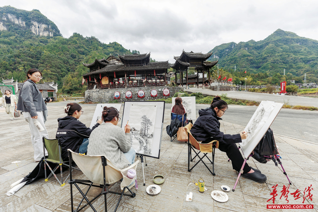 10月14日,吉首市矮寨镇坪朗村,河南科技大学美术学专业的学生在写生。近年来,该市扎实推进美丽乡村建设,传统村落得到有效保护,人居环境持续改善,吸引众多高校艺术学子前来写生创作。