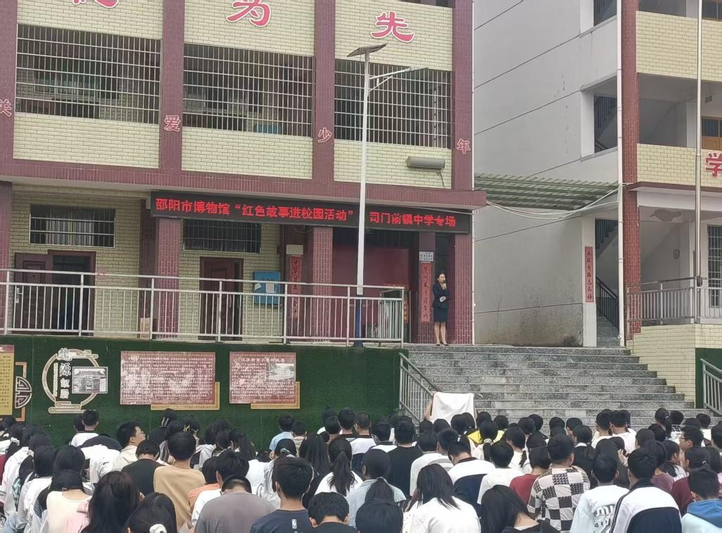 2025年10月17日上午,“红色故事进校园活动”宣讲活动在司门前镇中心中学正式举行,现场800多名师生及相关人员参加。宣讲员们通过姚喆、陈纯一、段泽、尹如圭、贺炳炎、廖耀湘、吴凯琴等抗日英雄的故事向师生们展示了邵阳人民在中华民族危亡的关头用生命和鲜血谱写的一曲曲英雄赞歌。宣讲员们以生动形象的语言让学生们在不知不觉间被革命先辈们的故事所感染,他们专注的眼神、认真的神情,听红色故事仿佛在与历史对话、汲取奋进的力量。