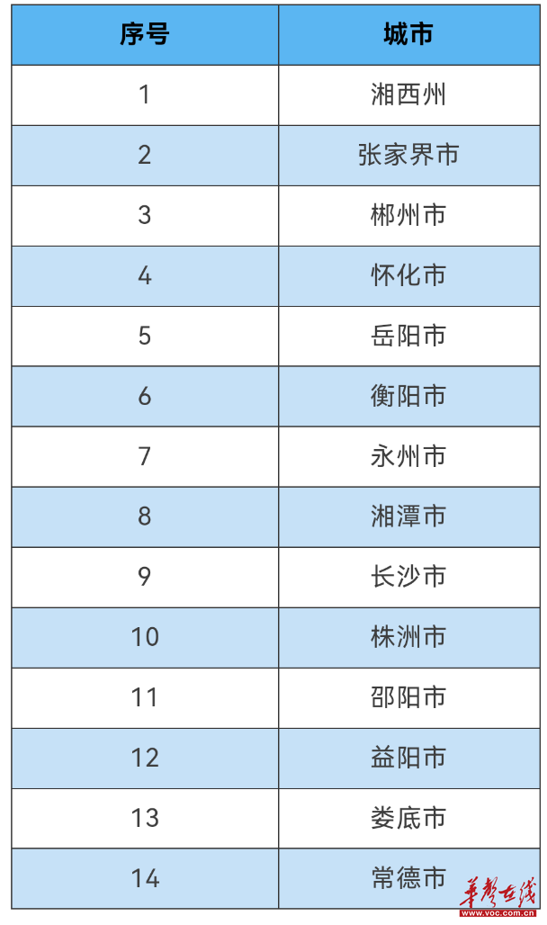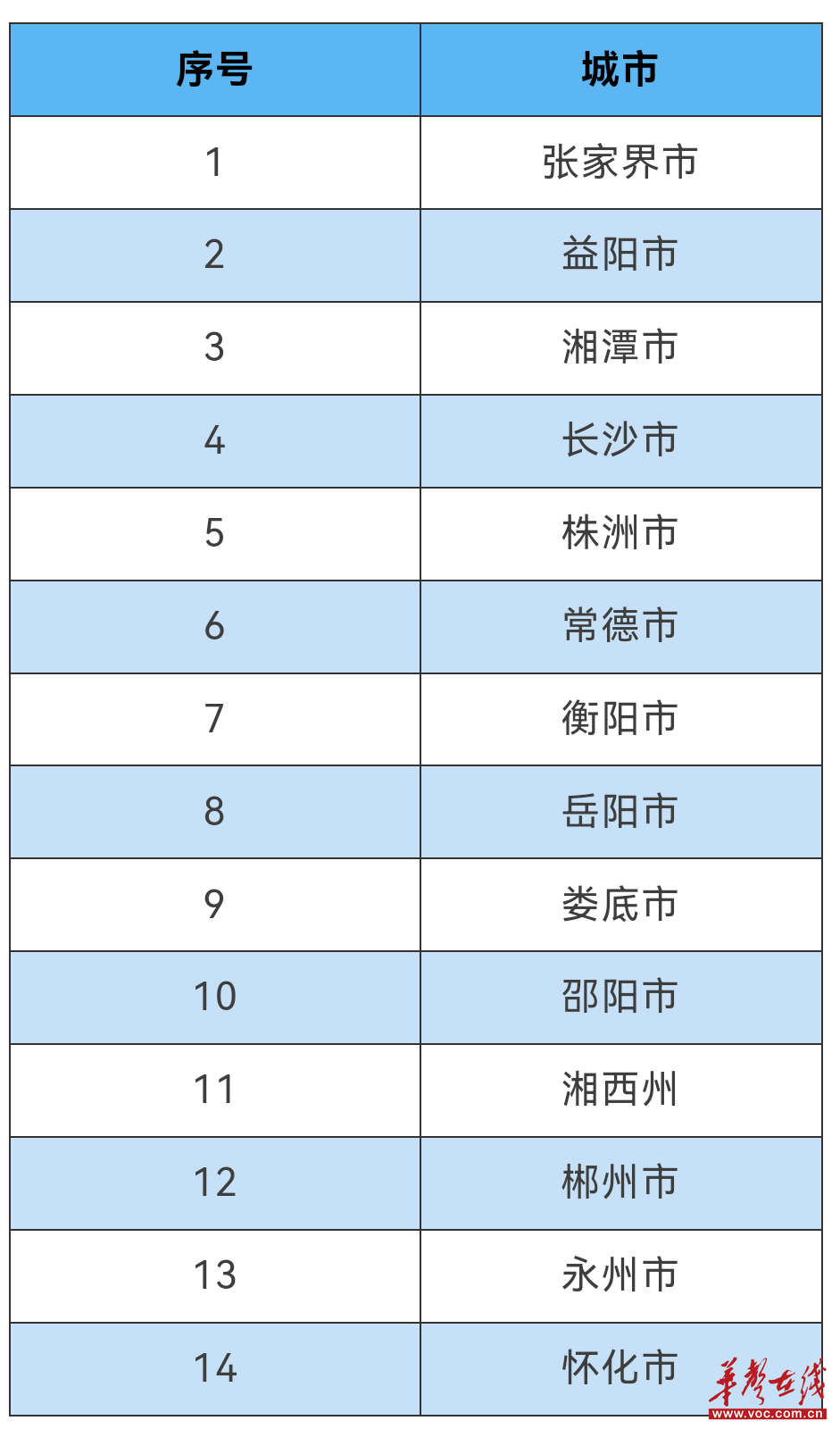 按PM₂.₅浓度同比变化,从好到差依次为:张家界市、益阳市、湘潭市、长沙市、株洲市、常德市、衡阳市、岳阳市、娄底市、邵阳市、湘西州、郴州市、永州市、怀化市。
