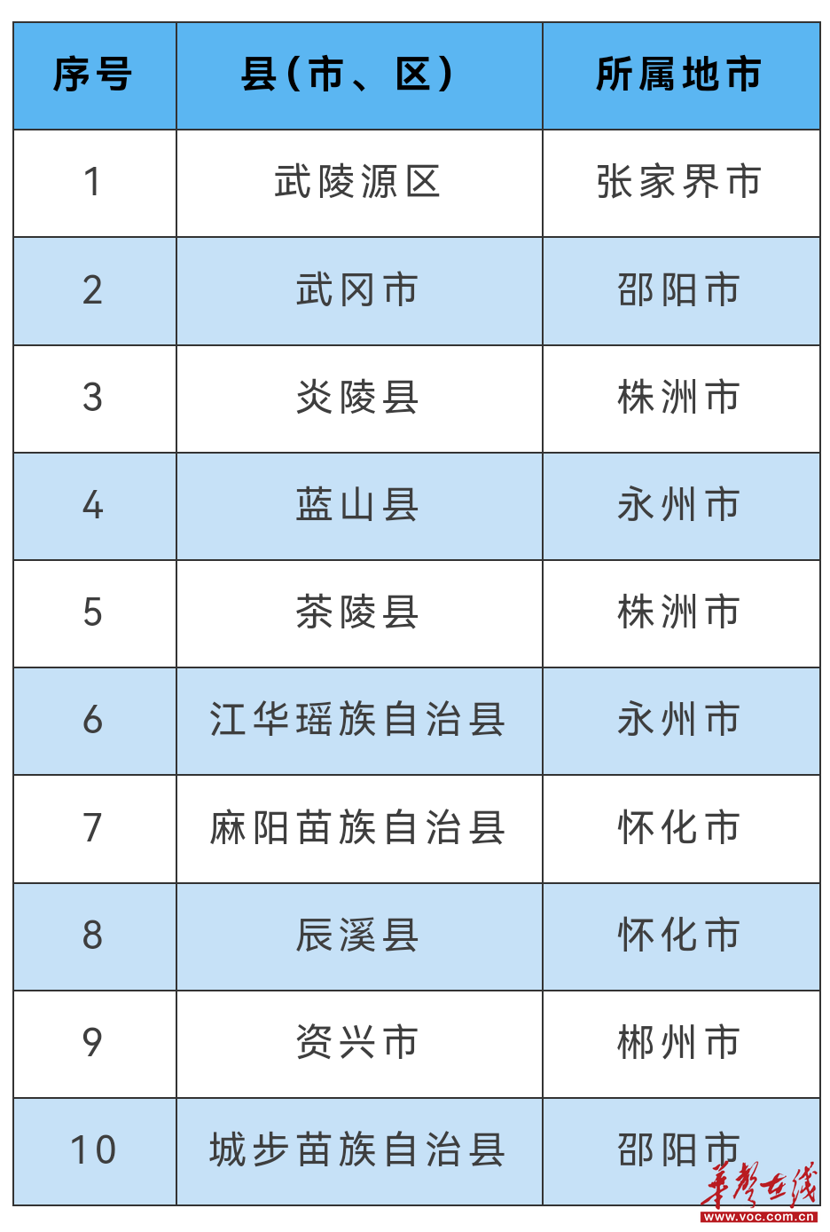地表水环境质量较差的后10个县(市、区)依次为:大通湖管理区、蒸湘区、南县、南岳区、澧县、长沙县、柳叶湖旅游度假区、君山区、衡阳县、临武县。