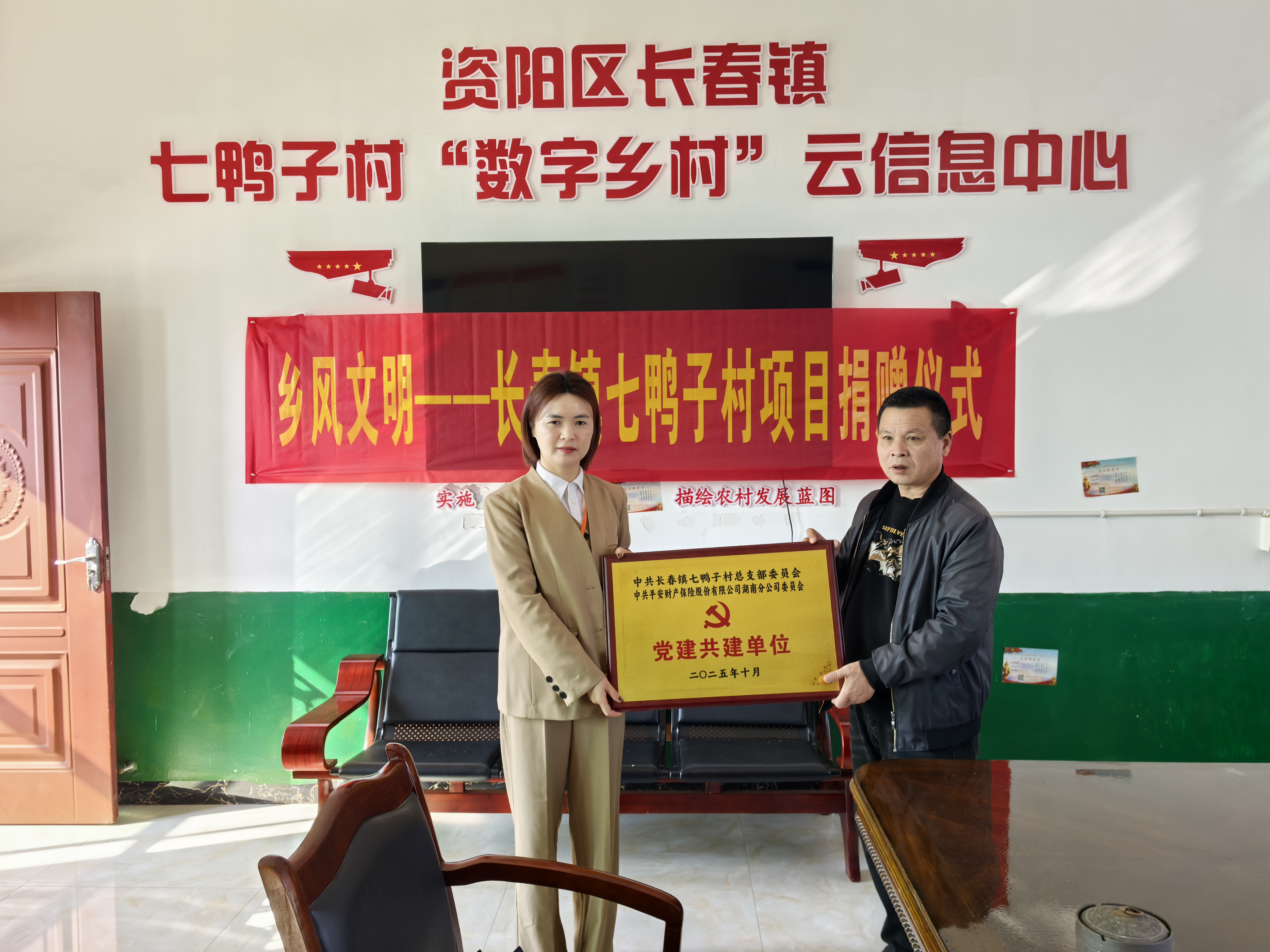 华声在线10月25日讯(通讯员 祝伟)为深入贯彻落实国家乡村振兴战略,切实履行企业社会责任,落实平安集团三下乡——保险下乡要求,近日,中国平安财产保险股份有限公司资阳支公司(以下简称“平安资阳支公司”)与益阳市资阳区长春镇七鸭子村联合开展了以“党建共建聚合力,精准帮扶促振兴”为主题的党建共建活动,并向七鸭子村进行了专项爱心捐赠,以实际行动助力当地发展。