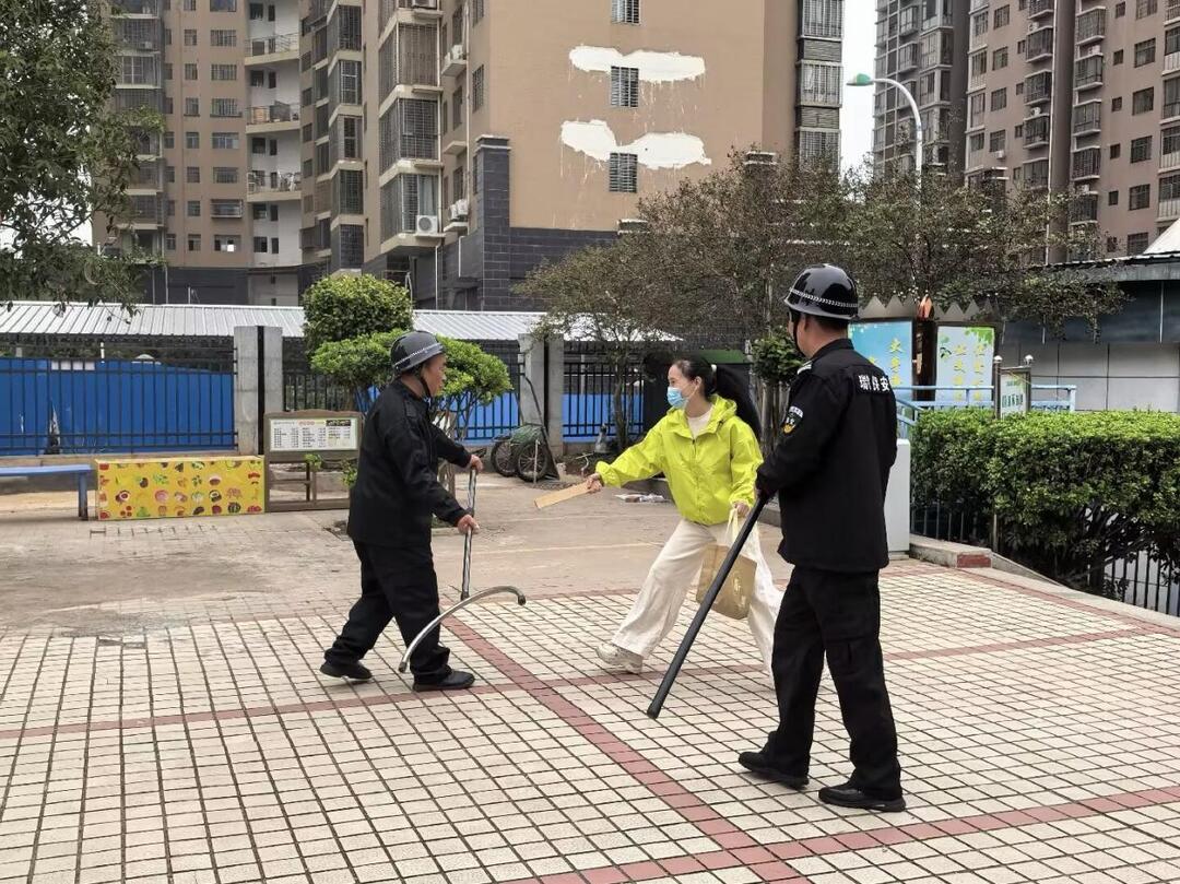 演练结束后,政教副主任付国萍同志随即组织全体教职工开展反恐怖基础知识宣讲。她详细讲解了防暴盾牌、钢叉、警棍等器械的功能特性及规范使用方法,并重点强调了"先防护、后制服,以控制为目的"的处置原则。为检验器械实操熟练度,现场特别组织保安人员进行模拟对抗演练,通过设置"歹徒持械冲击"实战场景,进一步检验了安保人员的器械配合能力与应急处置技巧。