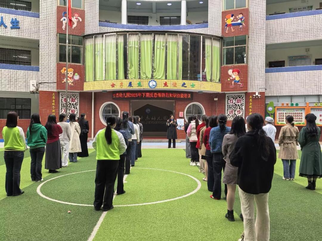 华声在线10月28日讯(通讯员 胡井芬)为全面筑牢幼儿园安全管理防线,切实提升全体师生的反恐防暴安全意识与应急处置实战能力,确保在突发暴力事件中最大限度保障幼儿生命安全,桂阳县士杰幼儿园于2025年10月27日成功组织开展反恐防暴应急综合演练。本次活动采用"实战模拟+专业培训"双轨模式,全园师幼、安保及后勤职工全员参与,通过沉浸式场景体验与规范化处置流程演练,为孩子们构筑起一道坚不可摧的校园安全屏障。