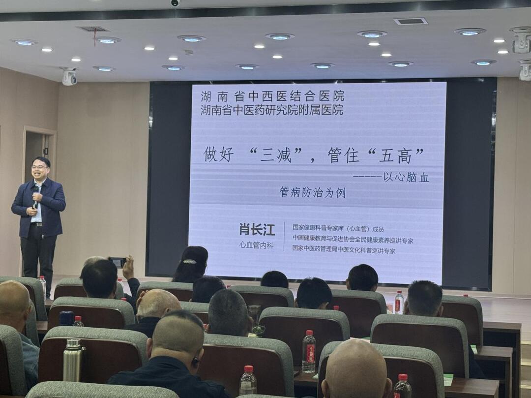 活动中,湖南省中西医结合医院党委常委、副院长肖长江以《关注健康 幸福人生》为题开展健康讲座,围绕高血压、糖尿病等常见病防治及中医养生知识进行科普,并特别针对社区内老年居民的饮食习惯,融入“药食同源”“因地制宜”的中医理念,提出个性化健康建议。