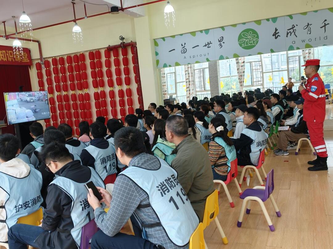 活动伊始,社区工作人员及消防专业人士为家长们带来了一堂生动实用的消防安全知识讲座。讲座结合火灾警示教育视频,剖析家庭火灾的常见诱因、初期火灾的扑救方法、火场逃生自救技巧以及如何正确报警等关键知识,让在场所有人直观感受到火灾的无情与防范的重要性,起到了强烈的警示作用。同时,科普灭火器“提、拔、握、压”的使用要领,以及家庭常备消防器材种类。现场还发放了消防安全宣传单,进一步普及日常防火常识。