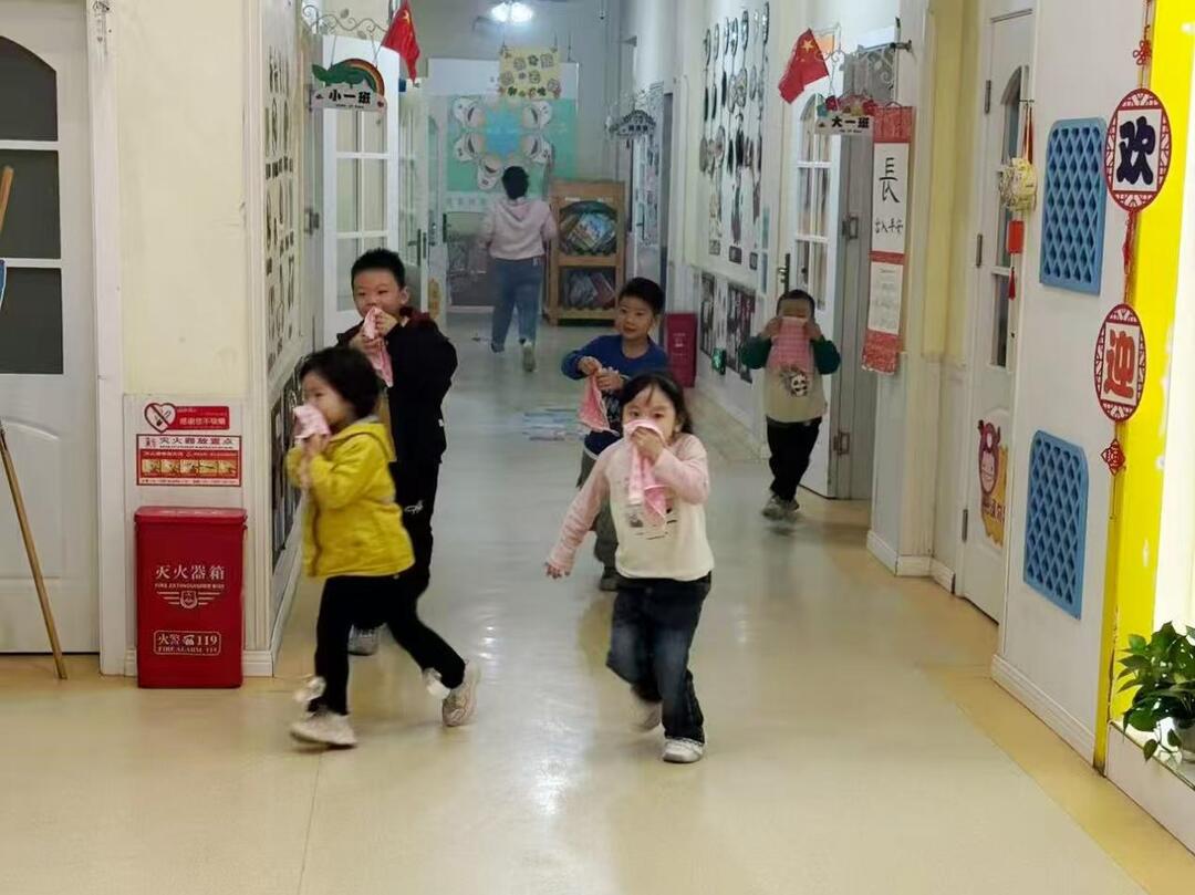 上午10点30分,随着模拟烟雾的升起和急促的警报声,全体幼儿在老师的引导下,立刻进入了紧急状态。孩子们反应迅速,用湿毛巾捂住口鼻,弯腰低姿,沿着预定的疏散路线,快速、有序地向安全地带撤离。整个过程中,老师们分工明确,守在走廊、楼梯等关键位置,确保不落下一名幼儿。不到3分钟,全园师生已全部安全抵达前坪集合点,各班老师迅速清点并上报人数,疏散全程井然有序,孩子们的表现沉着冷静。