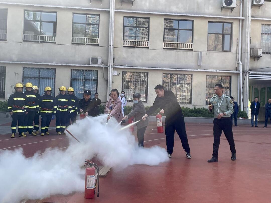 紧接着是灭火实操环节,消防大队的负责人给全体师生做了灭火器使用的实操演练,手把手教大家“一提、二拔、三握、四压”的核心要领。之后,保安和教师代表主动参与实操,亲手扑灭模拟火源,真正掌握了灭火器灭火的实用技能。