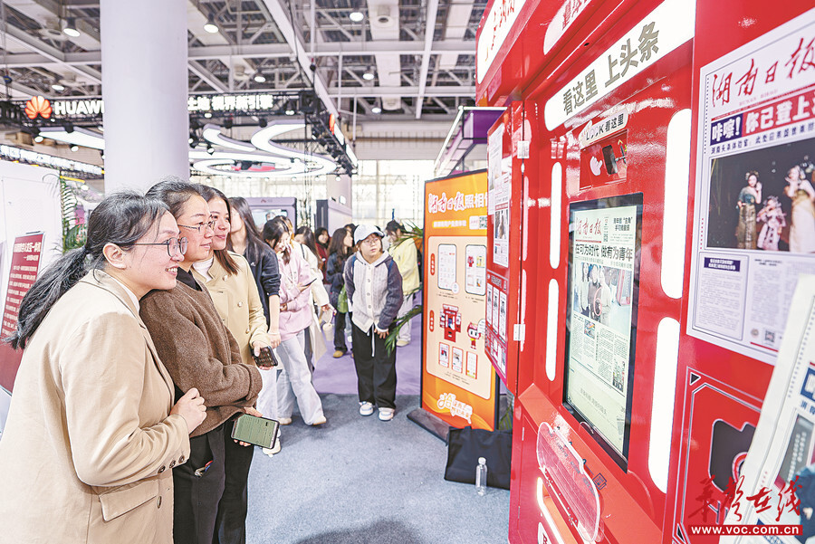 11月13日,湖南国际会展中心(芒果馆),观众在2025中国新媒体技术展上体验新湖南自动拍报机。