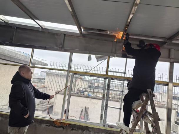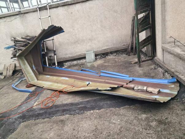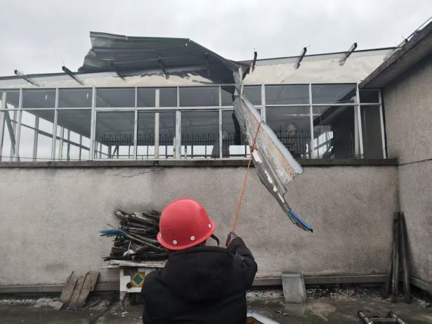 施工人员先用绳索固定松动构件,再分步拆除锈蚀部件,全程避免材料坠落;拆除后的铁皮雨棚被转移至地面,杜绝二次隐患。处置完成后,工作人员把楼顶的残留杂物进行清理,并对墙面连接点进行加固处理。