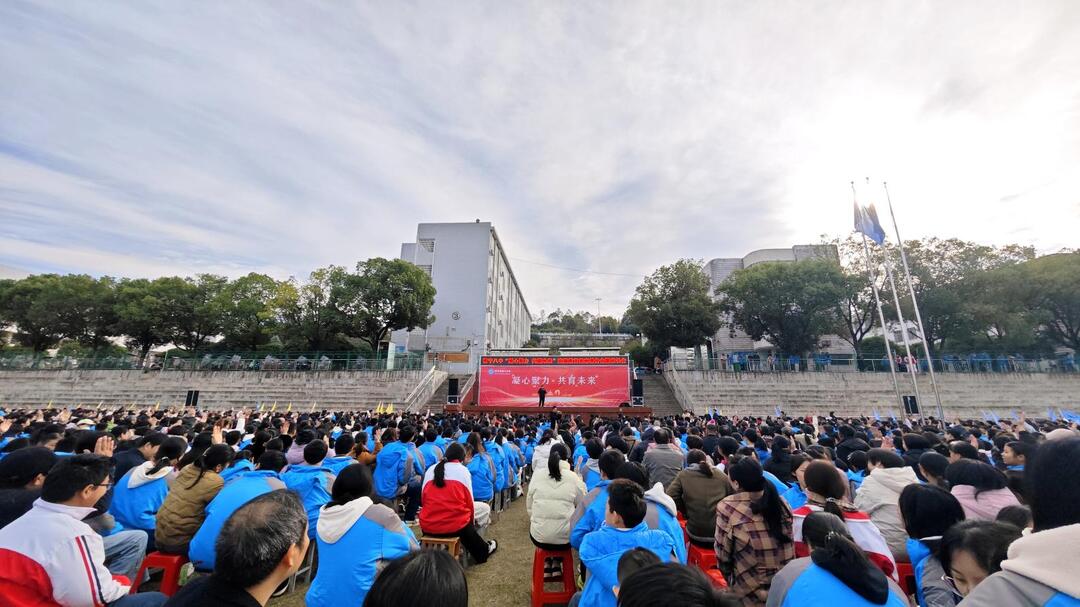 随后,戚毅老师带来《凝心聚力 共育未来》主题励志报告。他结合20余年教育实践,从“家庭角色定位”“亲子沟通艺术”“成长动力激发”三个层面展开分享。戚老师强调:“‘凝心’是前提——家长要与孩子‘心贴心’,而非‘背靠背’;‘聚力’是关键——家校目标一致,才能形成教育合力。”