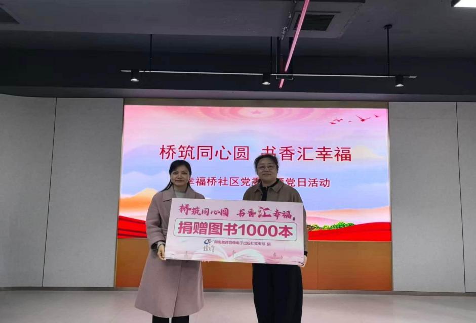 随后进行的“爱心传递”环节将活动推向高潮。湖南教育音像电子出版社党支部向幸福桥社区捐赠了一批优质图书,并正式启动“双社共建,开心成长”公益教育项目。该项目将依托出版社丰富的教育资源,为辖区儿童提供科普实验、阅读指导、趣味体育等多样化服务,助力青少年健康成长。