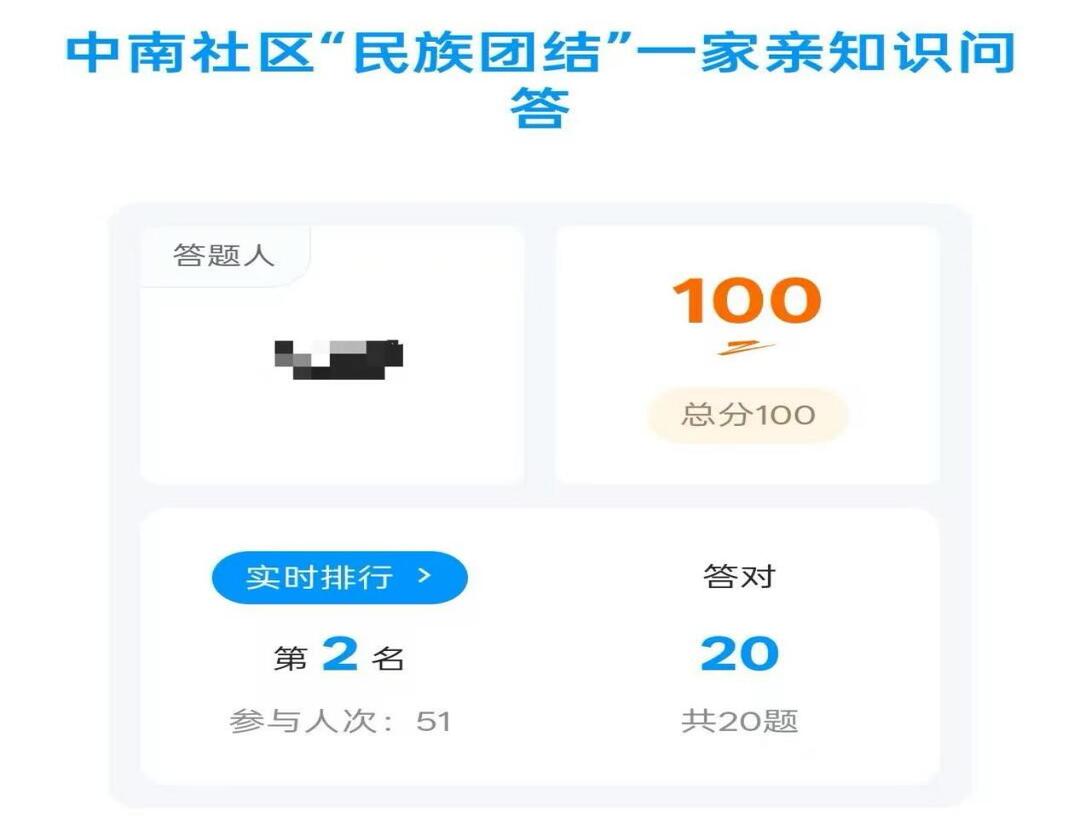 线上广泛参与,学习便捷有趣。社区依托“居民微信群”、“三长联络群”等渠道,举办“民族团结一家亲·知识问答暖人心”有奖问答活动。题目涵盖民族政策、风俗文化和历史常识等,兼具知识性与趣味性,有效普及了民族团结相关知识。活动吸引了各族居民的广泛参与,共收到有效答卷86份,其中81名居民成绩达标,大家互相分享学习心得,邻里感情在热烈的氛围中进一步升温。