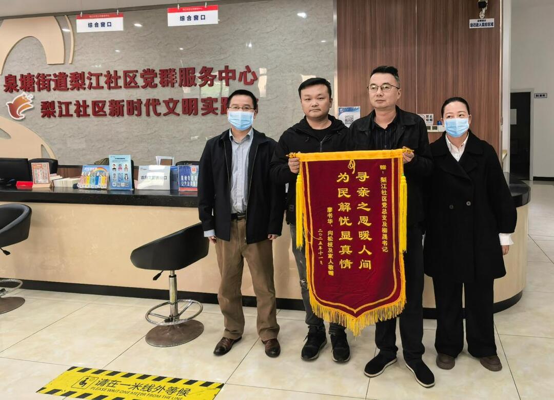 走失男子家人给梨江社区党总支书记柳晟送来锦旗