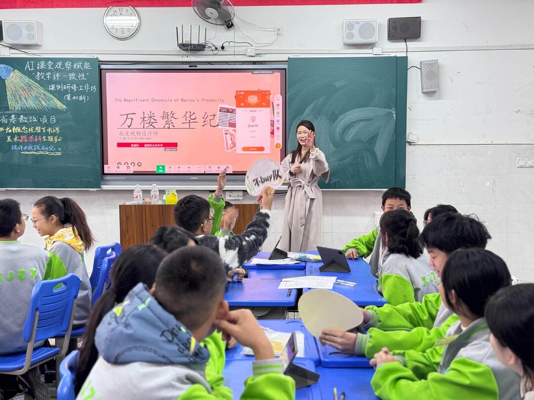 在引导者罗雨晴老师的带领下,与会教师聚焦“教学评一致性”这一核心观察点,进入课中观察。陈婳玙老师的课堂上,AI课堂观察系统同步采集师生互动、学习支架运用等过程数据。课堂中,学生们分组团结协作,融合美术、数学、语文、信息技术等多学科知识,以湘潭万楼景区为载体,通过制定与优化游戏规则,绘制版面,设计纸影风格桌游规则手册。让学生在跨学科项目式活动实践中传承本土文化、提升综合素养,正是省基教改课题的核心研究成果之一。