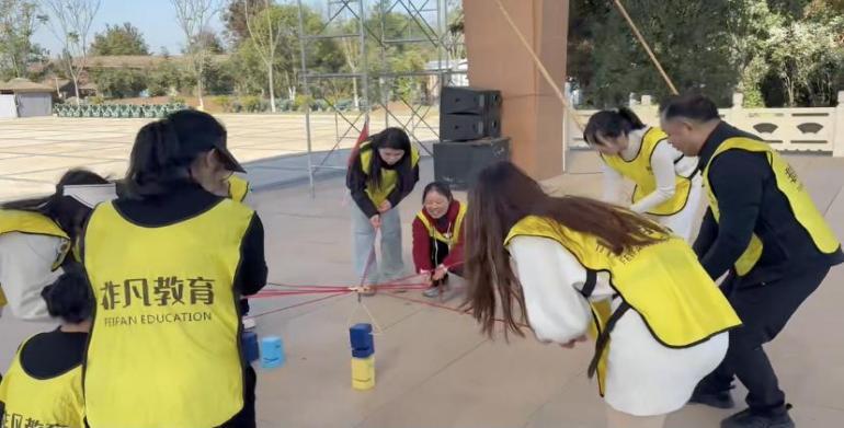 上午九点半,活动在专业的“律动破冰”中拉开序幕。在教练的带领下,老师们通过有趣的互动迅速拉近距离,并组建团队、推选队长、副队长,共创队名与口号。随后开展的团队挑战赛将气氛推向高潮——“移花接木”考验反应与默契,“步步高升”挑战无声协作,“珠行万里”强调流程衔接与责任意识。三个项目环环相扣,不仅充满趣味,更在轻松氛围中深化了团队信任与协同意识。