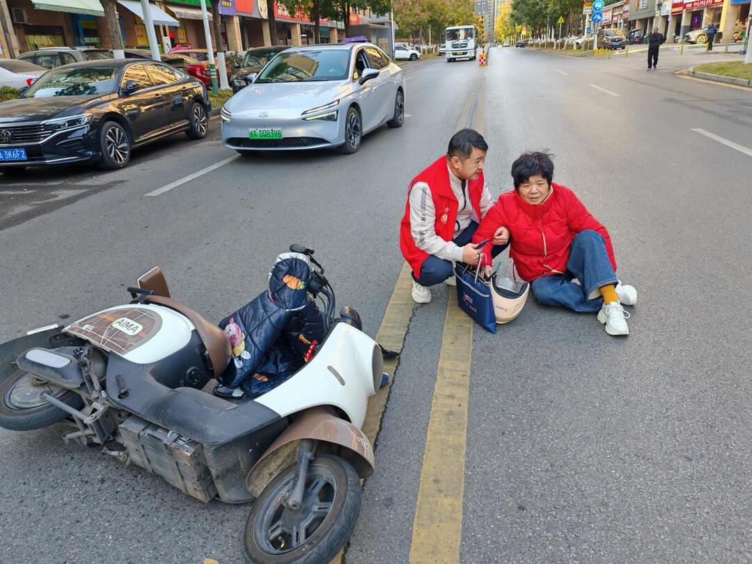 12月3日下午,耿飞像往常一样在金甲冲路金湘苑东门路段开展巡查工作。突然,一阵急促的碰撞声传来,他循声望去,只见一名骑电动车的阿姨被一辆黑色奥迪SUV撞倒在地,身体蜷缩在路边,情况十分紧急。