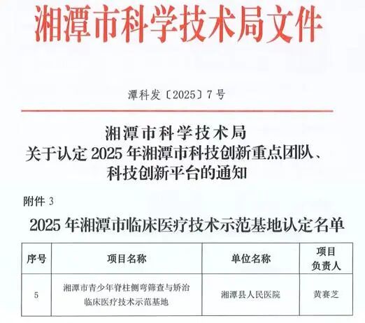华声在线12月5日讯(通讯员 何腾蛟)近日,湘潭市科学技术局发布认定通知,湘潭县人民医院康复医学科牵头申报的“湘潭市青少年脊柱侧弯筛查与矫治临床医疗技术示范基地”成功获批。