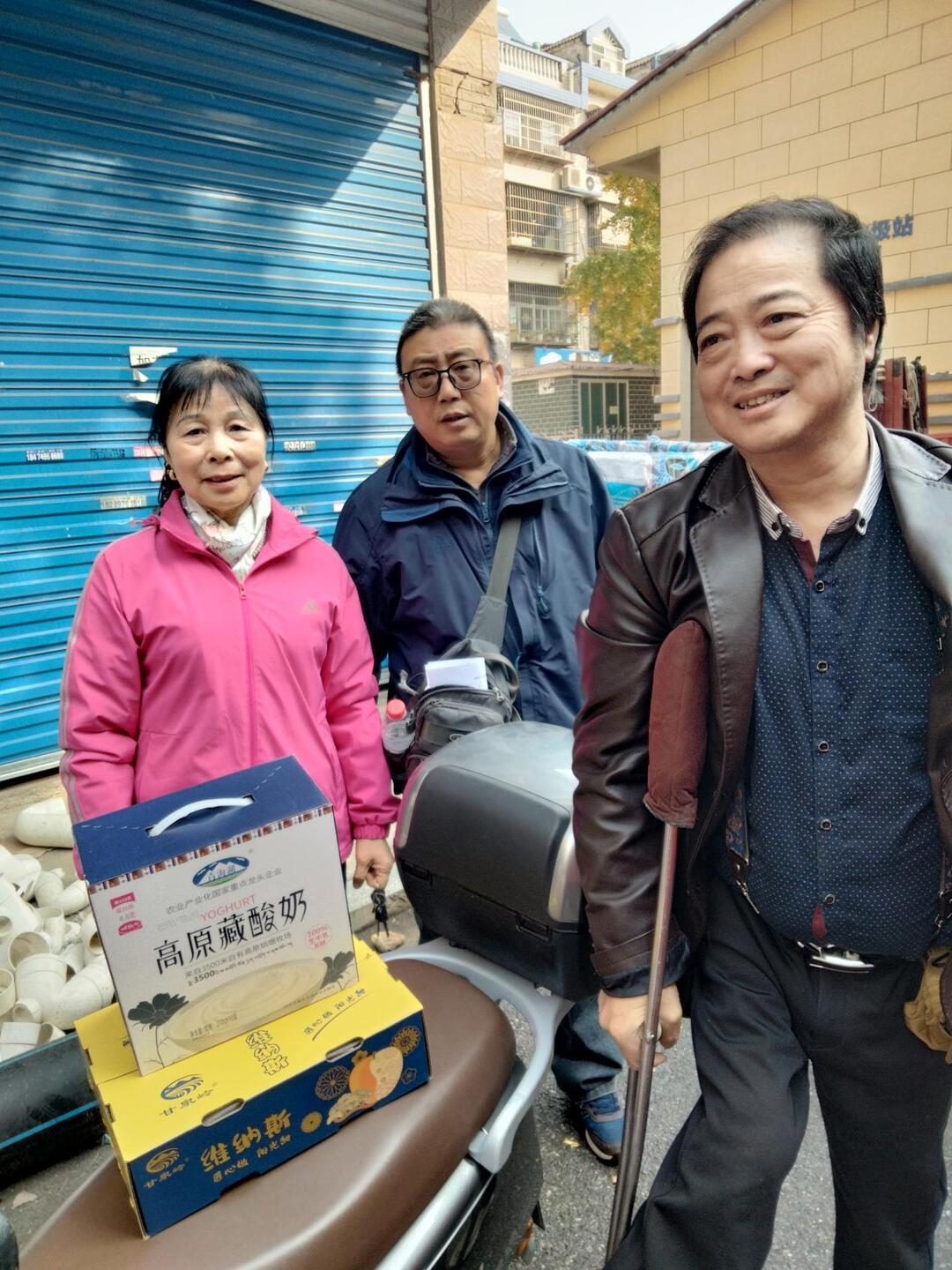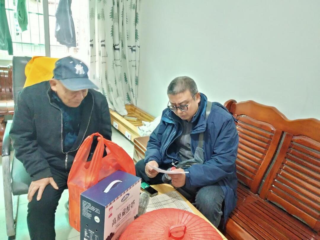 在百世快运长沙芙蓉区三湘分公司门口,团队成员与一位拄拐村民热情交流,仔细询问其工作与生活情况,为其送上慰问品,还提供了针对性的心理疏导。随后,团队走进村民家中,与老人围坐桌前,一位成员拿着记录册,认真倾听老人的心声,为其排解情绪困扰,另一位则贴心送上慰问物资。