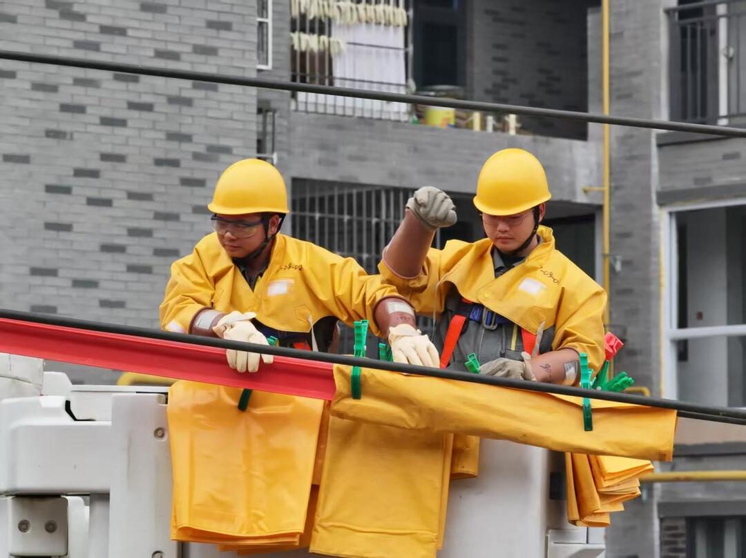 “各点位准备就绪,是否开工?”现场监护人员逐项核查P49、P55杆及中间杆位安全措施、人员到位情况后,向总指挥汇报。“准备就绪,开始作业!”随着总指挥一声令下,带电改造正式启动。三地作业人员分工协作、默契联动,4台绝缘斗臂车在对应杆位精准就位构建立体作业面,针对同杆架设线路特点,严格执行分层作业规范,地电位人员操作绝缘杆稳妥完成双回导线遮蔽固定,等电位人员沿绝缘软梯平稳进入强电场,严守安全距离开展导线切割与接续;地面辅助人员通过绝缘绳精准传递工具,全程设置安全隔离区与警示标识,筑牢安全防线。