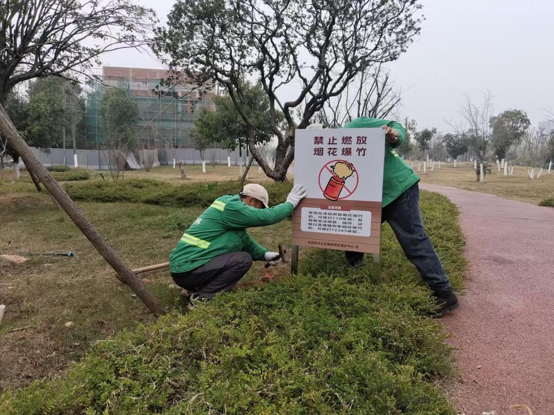 公园作为城市绿色空间与市民休闲聚集地,树木植被繁茂、人员往来密集,燃放烟花爆竹容易引发火灾事故,不仅会破坏生态环境、损毁绿化景观,更将直接危及群众生命财产安全。根据《长沙市人民政府关于长沙市城区禁止和限制燃放烟花爆竹的通告》要求,风景名胜区、园林、公园等公共场所禁止燃放烟花爆竹。为贯彻落实禁燃规定,天心区园林绿化维护中心将禁燃宣传作为当前一项重点工作,精准选址、统筹推进,把宣传牌安装在公园主入口、休闲广场、步道沿线、亭廊休憩区等人员集中区域,实现“入园即见、抬头即视”的全覆盖宣传效果。同时,中心安排值班值守力量向游客朋友现场讲解燃放烟花爆竹对园林生态和公共安全的危害,倡导大家共同守护绿色家园。