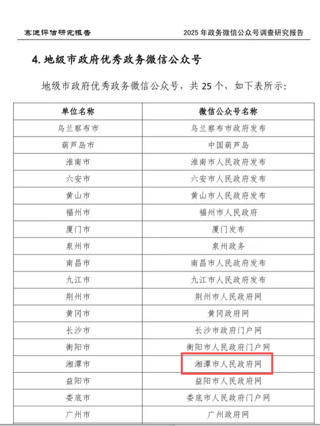 华声在线1月13日讯(通讯员 罗昕)日前,2025年中国优秀政务平台(数字政府)推荐及综合影响力评估结果正式发布,湘潭市数字政府建设在多项调查评估中表现突出,湘潭市人民政府网站获评“2025年度中国优秀政务网站”,“湘潭市人民政府网”微信公众号入选“全国地市级政府优秀政务微信公众号”。两大平台齐登全国优秀榜单,既彰显了湘潭数字政府建设的硬核实力,更传递出“以人为本、数字便民”的服务温度。