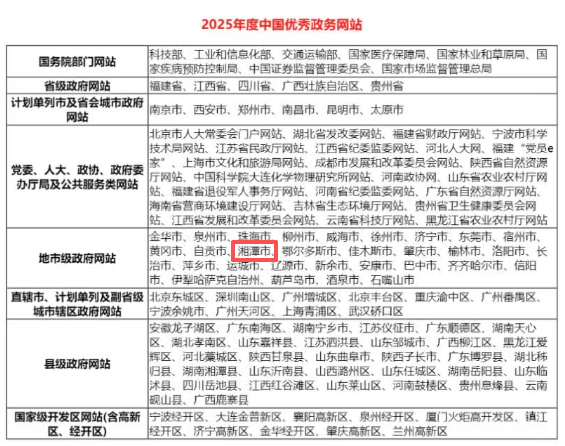近年来,湘潭市人民政府网站紧扣数字政府建设部署,锚定“数字赋能、高效便民”主线,持续优化政府门户网站服务功能,推动政务服务提质增效,完善数据资源融合创新,让群众办事更便捷、信息获取更高效。凭借其优秀的建设水平、全面的服务功能与良好的用户体验,成功获评“2025年度中国优秀政务网站”,这也是对湘潭市政府网站建设的高度肯定。