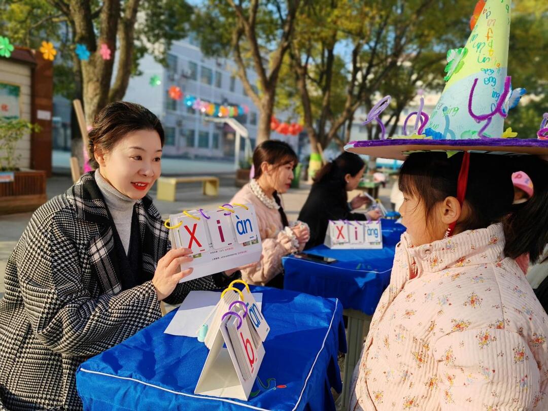闯关环节里,两大主题关卡人气爆棚。拼音主题“爱‘拼’才会赢,‘音’你而精彩”下设“声母韵母我会读”“音节拼读小能手”“看图拼音我能行”三个小任务。头戴自制拼音帽的孩子们手持闯关卡,自信认读卡片内容,流利拼读音节;遇到稍难的三拼音节时,也能沉着思考,在老师的轻声提示下顺利通关。