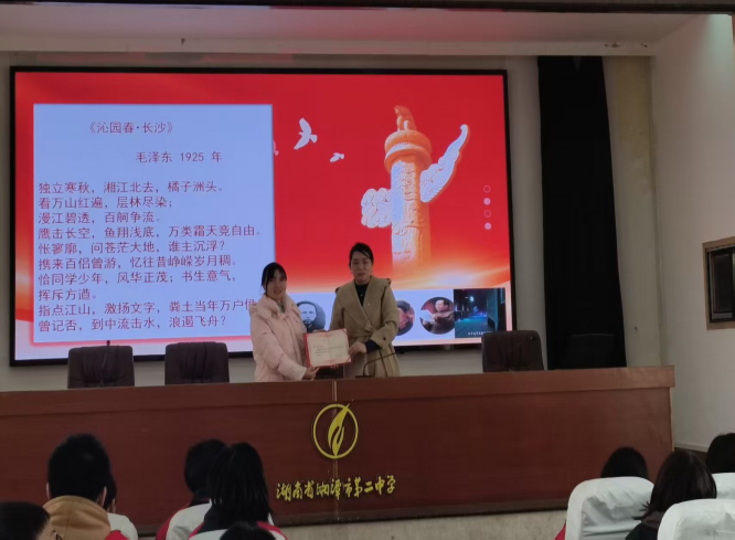 华声在线1月21日讯(通讯员 肖洁 沈斌)2026 年新春伊始,湘潭市第二中学“莼香园思政讲堂”如期开讲。作为学校党建带团建的精品活动,本次宣讲特邀湘潭市第四届中学历史名师工作室成员、湘潭市第二中学历史教师沈斌主讲,以《恰同学少年:承伟人之志,做更好的自己》为主题,带领师生在红色校史与历史德育的交融中,汲取成长力量。