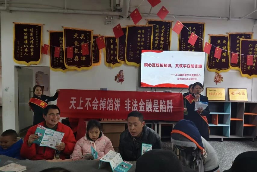华声在线1月29日讯(通讯员 田苑)1月23日,湖南银行湘西龙山县支行走进龙山县残疾人照料中心,开展了一场以“金融知识暖残友,防诈宣讲护平安”为主题的公益宣讲活动,旨在提升残疾人朋友的金融风险防范意识,守护其财产安全,在农历新年来临之际送去实用的金融知识与真挚的关怀。