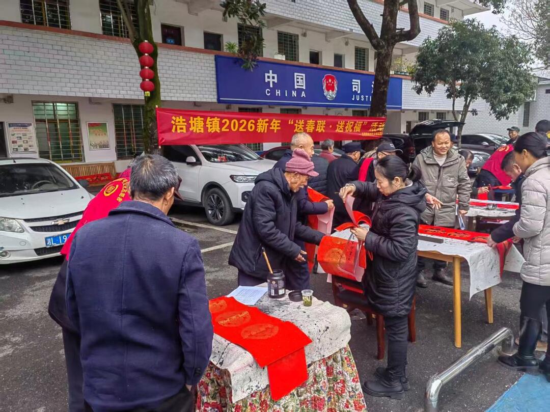 1月28日,腊月初十,年味渐浓,福意满盈。桂阳县浩塘镇政府操场墨香萦绕、暖意融融,镇新时代文明实践所组织开展了“浩塘镇2026新年送春联·送祝福”文化惠民活动。受邀参加写春联的有县文化馆、县书法协会的书法志愿者们,他们以笔墨为媒,为村民免费书写春联,把马年的祝福送到群众的家里。