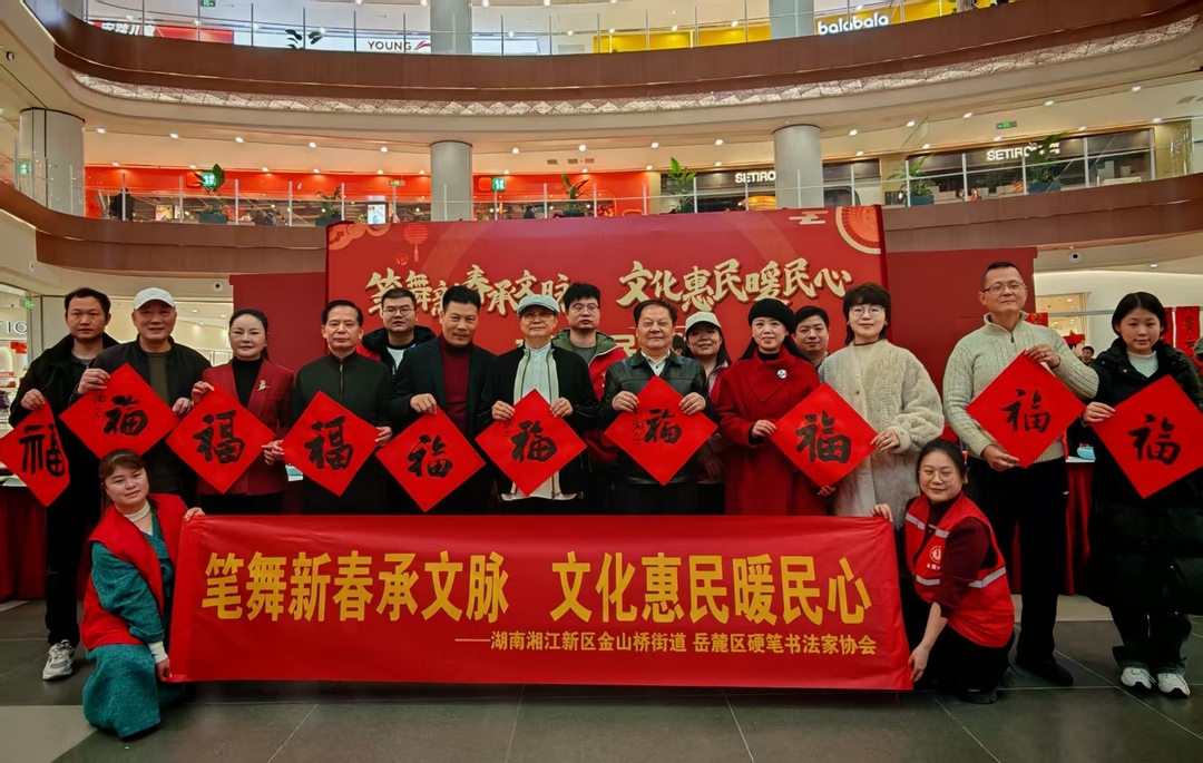 华声在线2月2日讯(通讯员 陈婷)腊月十三,年味渐浓,湘江新区金山桥街道永旺梦乐城一楼暖意融融。一张张大红宣纸整齐铺开,翰墨飘香间,一幅幅饱含深情的春联跃然纸上,居民们手捧墨迹未干的“福”字笑意盈盈……一场主题为“笔舞新春承文脉,文化惠民暖民心”的迎新春送春联活动在此温情启幕。这场活动以笔墨为媒传递新春祝福,以文化为桥传承中华文脉,为辖区群众送上了满满的新春暖意。
