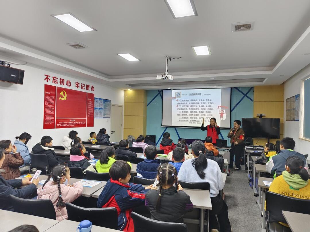 活动现场,开福区禁毒协会讲师施扬老师结合真实案例,深入浅出地剖析毒品危害,细致传授新型毒品辨别技巧,用通俗易懂的语言为禁毒教育筑牢知识根基。随着轻快旋律奏响,禁毒儿歌传唱环节率先拉开帷幕,孩子们以清脆嘹亮的嗓音演绎原创禁毒儿歌,浅显易懂的歌词搭配活泼灵动的动作,让“远离毒品”的理念在朗朗传唱中自然浸润心田,现场氛围温馨而热烈。紧随其后的是禁毒健康操展演,将活动气氛推向高潮。孩子们精神抖擞、舒展肢体,抬手、弯腰、转身等每一个节拍都巧妙融入“拒绝诱惑”“守护健康”的禁毒寓意,把抽象的防毒理念转化为直观生动的肢体语言。这种“运动+教育”的创新形式,让孩子们在锻炼身体的同时深化禁毒认知,陪同参与的家长纷纷点赞:“新颖又有效,孩子愿意学、记得牢!”